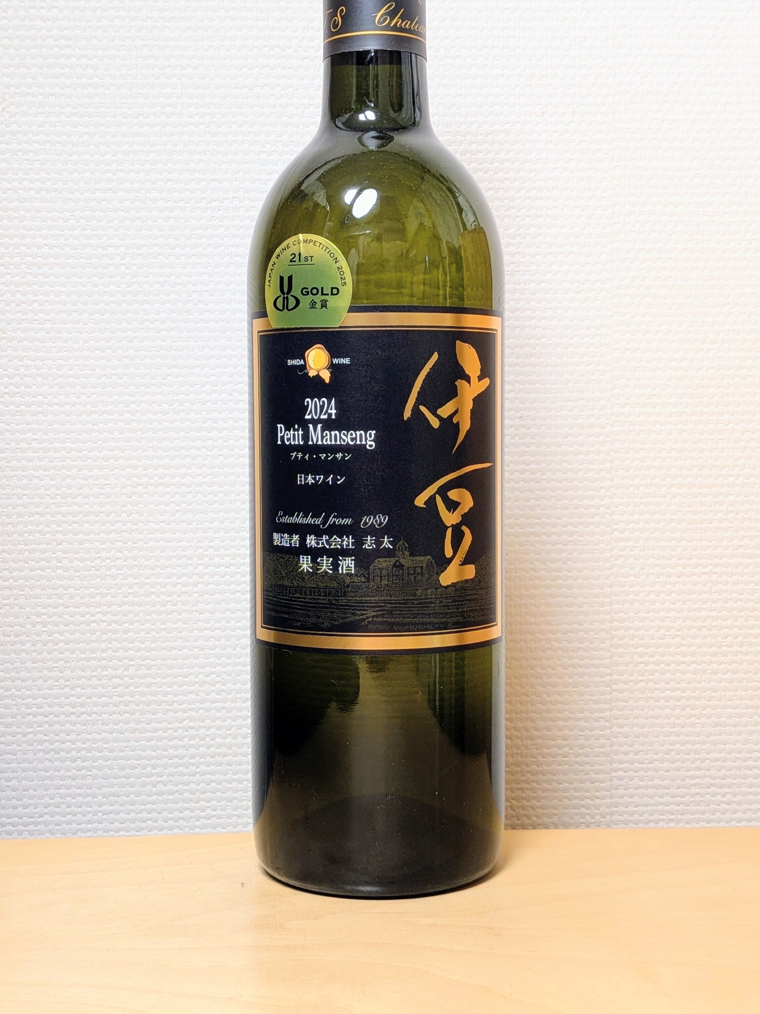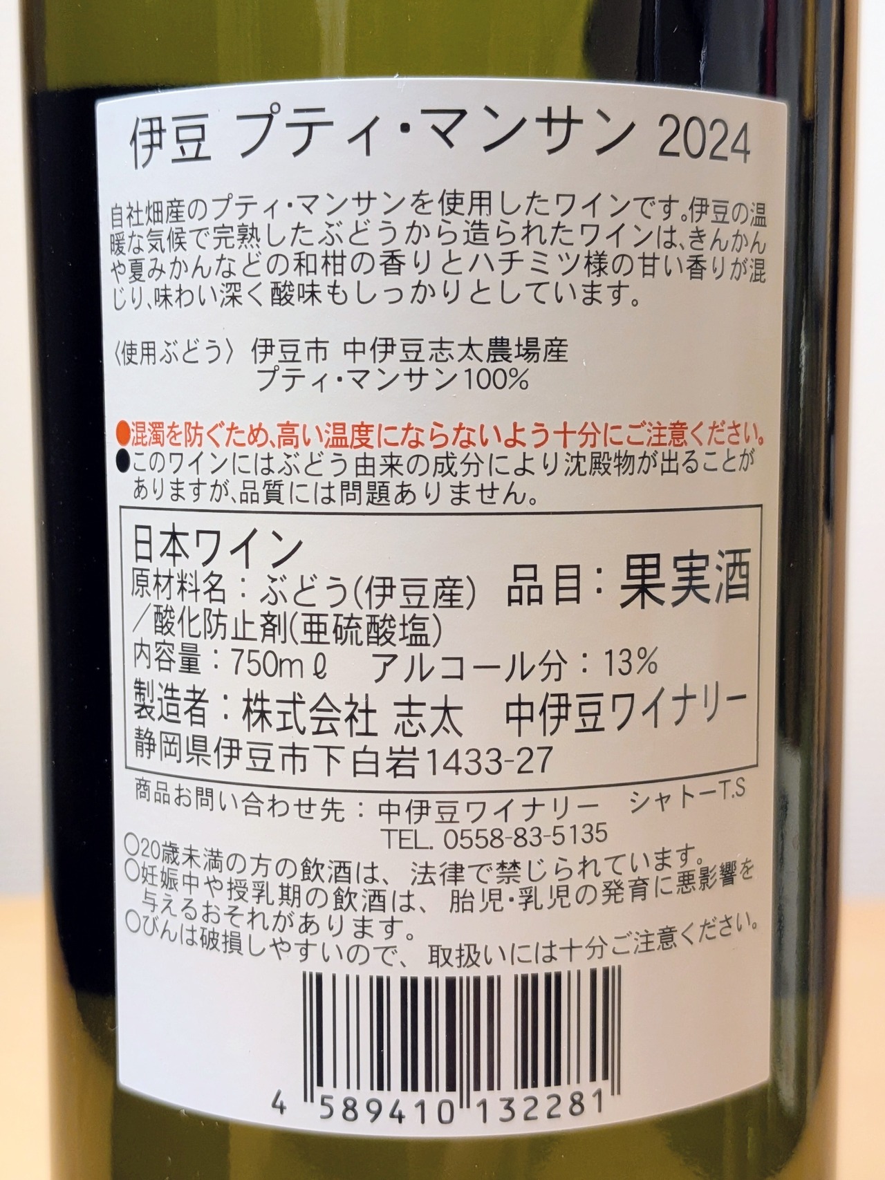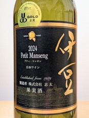 自社畑産のプティ・マンサンを使用したワインです。伊豆の温暖な気候で完熟したぶどうから造られたワインは、きんかんや夏みかんなどの和の柑橘の香りと、ハチミツのような甘い香りが混じり、味わい深く酸味もしっかりとしています。