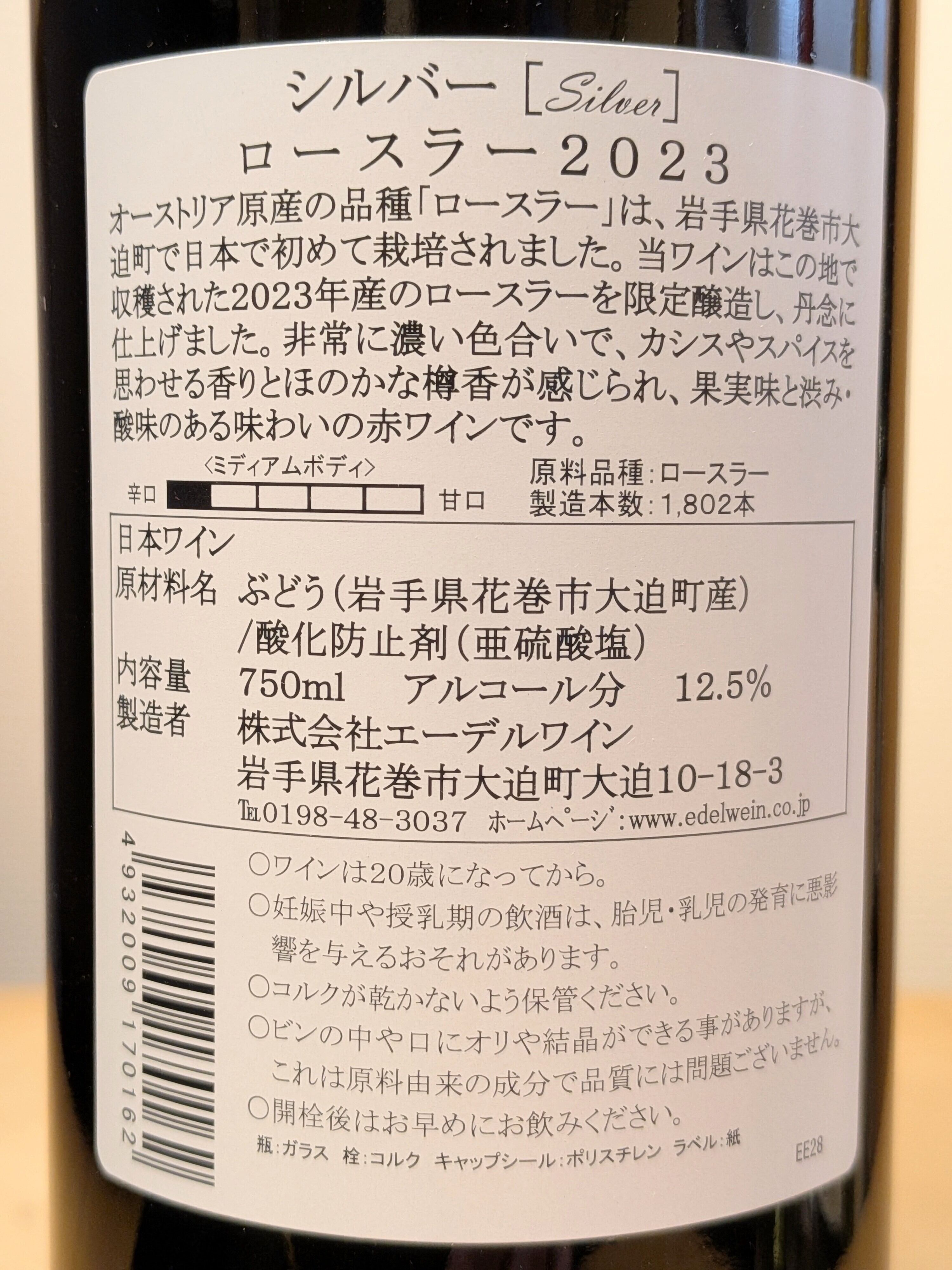 非常に濃い色合いで、ドライフルーツを思わせる香りが感じられ、果実味と渋み・酸味のあるしっかりとした味わいの赤ワインです。